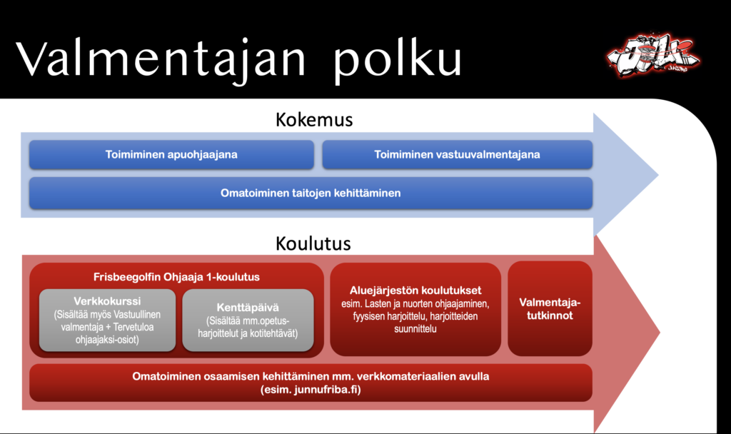 Ohjaajan peruskoulutus on liiton Frisbeegolfin Ohjaaja 1-koulutus. Koulutus pohjaa osin JyLin juniorivalmennuksen ohjelmaan. Ohjaajakurssin osana käydään myös Olympiakomitean Vastuullinen valmentaja ja Tervetuloa ohjaajaksi-osiot.